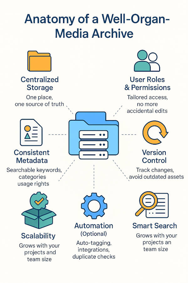 Here are the key elements that define a well-organized media archive: