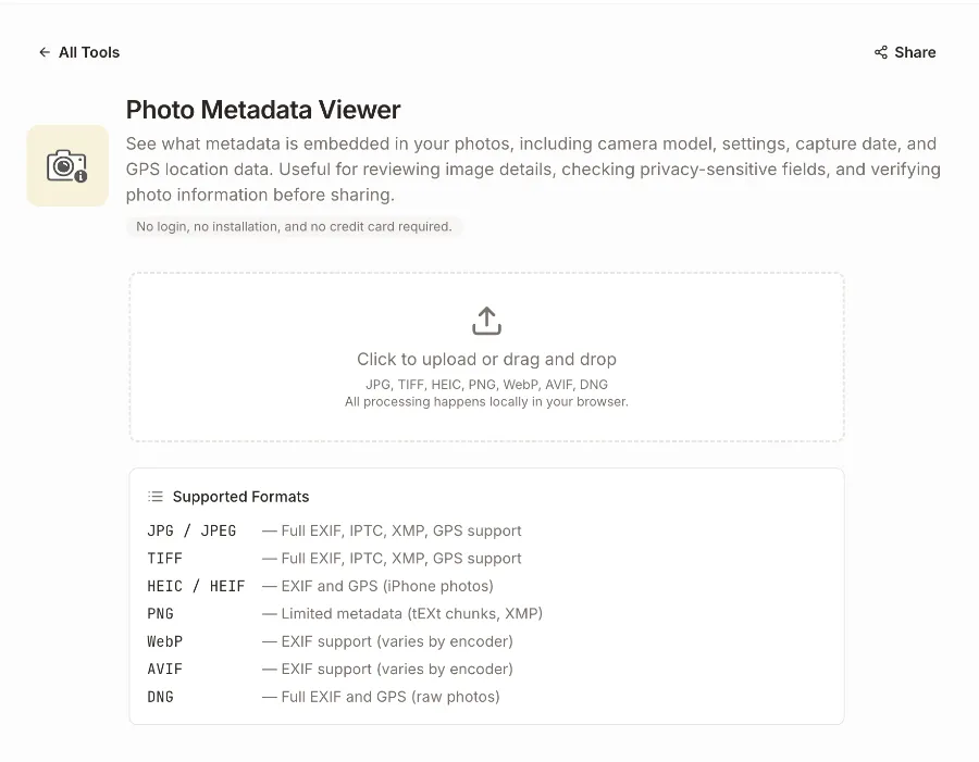 Before comparing desktop apps, creative tools, and DAM systems, try Daminion’s Photo Metadata Viewer. This browser-based tool lets you inspect photo metadata online with no login, no credit card, and no installation required.