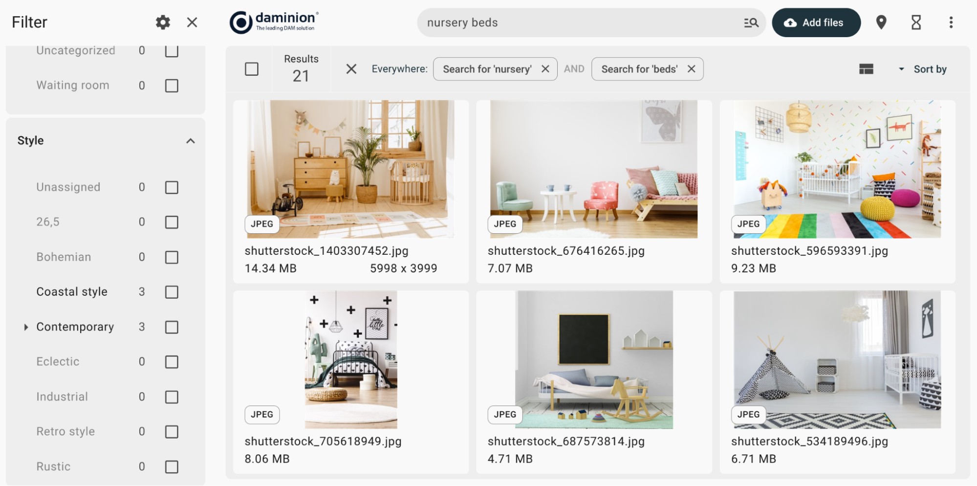 Now you can use a search query such as “nursery bed” and get a sensible selection of all visual content that matches this description. You can further refine search results by file type, date, category, licensing terms, and so on.