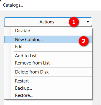 In the Catalogs dialog box click the Actions button and from the dropdown list select New Catalog.