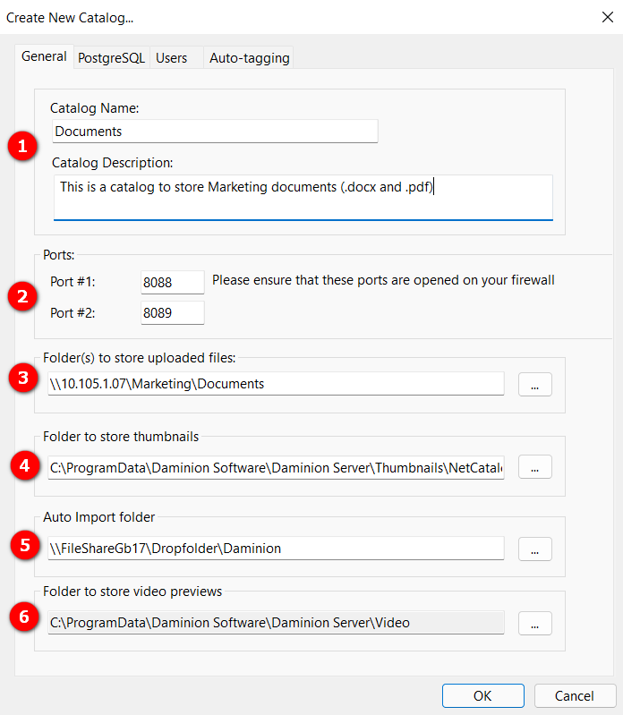 By default, Daminion occupies 8082 and 8084 ports for the default NetCatalog. When a new catalog is created, the next pair of available ports is assigned automatically: 8083 and 8085; 8086 and 8087, etc. If necessary, change the ports used by this catalog.