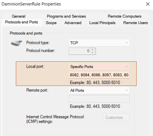 Remember to open the ports on your firewall via Windows Firewall with Advanced Security > Inbound rules > DaminionServerRule > Protocols and Ports > TCP: Local Port: Specific ports > add the ports that are used by Daminion catalogs.