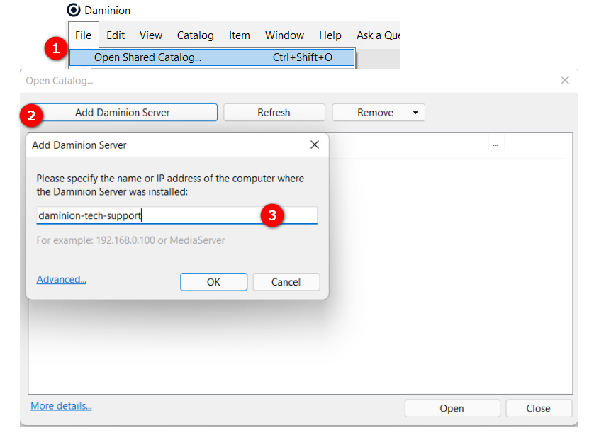 Launch Daminion Desktop client. In the File menu go to “File” > “Open shared catalog”, click Add Daminion Server and specify the server name or IP.