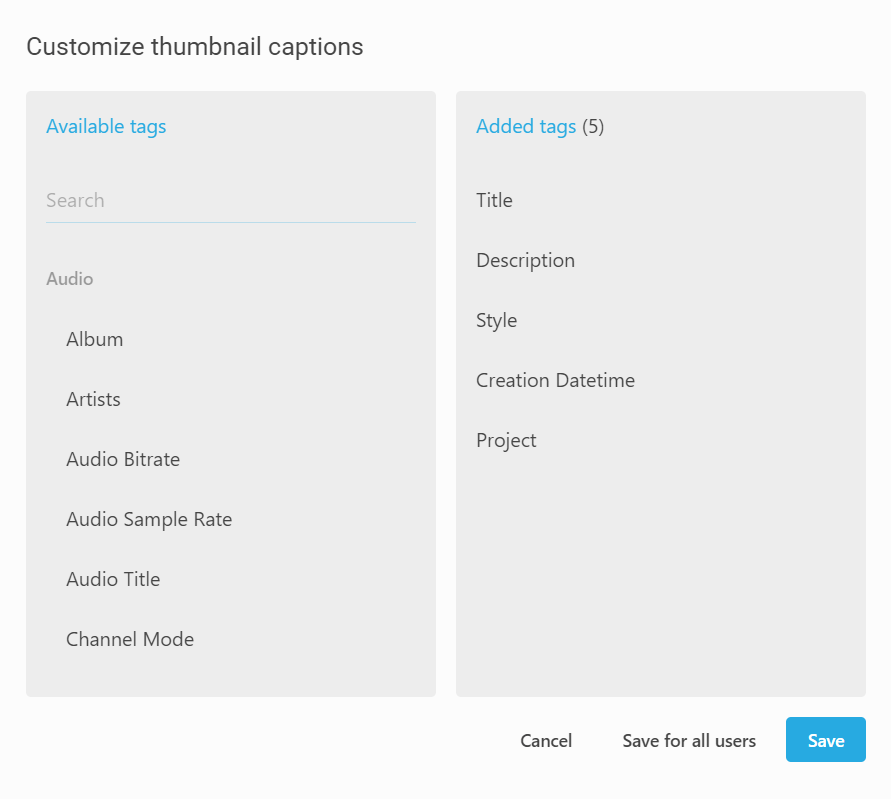 In the window that opens, add tags that should be displayed as thumbnail captions. You can select as many tags as you want to out of all available tags.