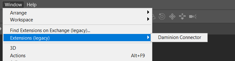 To activate the Daminion Connector in Photoshop, install Daminion Connector first. After that open Photoshop, click on “Window”, navigate to “Extensions (legacy)” and click on “Daminion connector”.