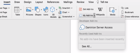 7 – In the opened document, navigate to Insert > My Add-ins > click on the down arrow > Daminion Server Access