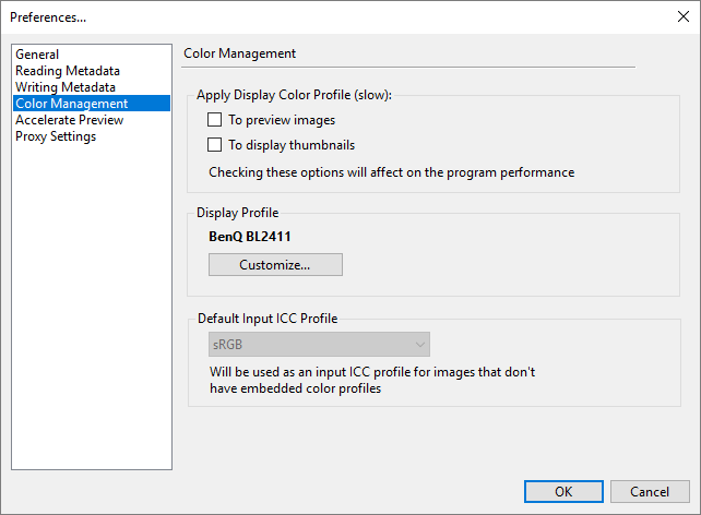Specify whether Daminion should use a color profile for displaying previews only, for displaying thumbnails only, or for displaying both.