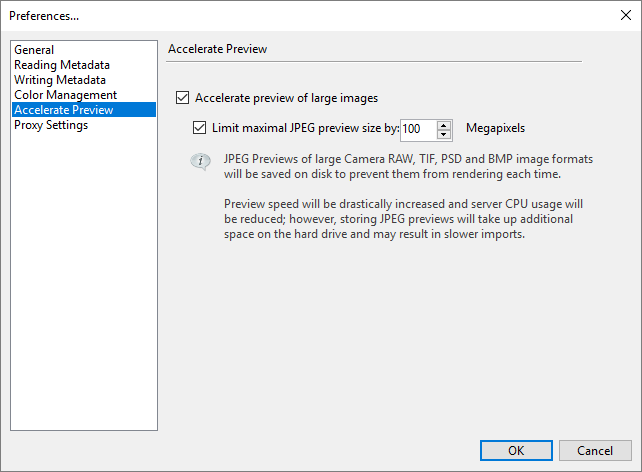 Here you can select whether Daminion should accelerate preview of large images and set a maximal JPEG preview size.