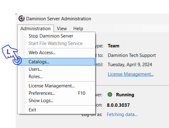Open the Daminion Server Administration Panel, click Administration, and then select Catalogs.