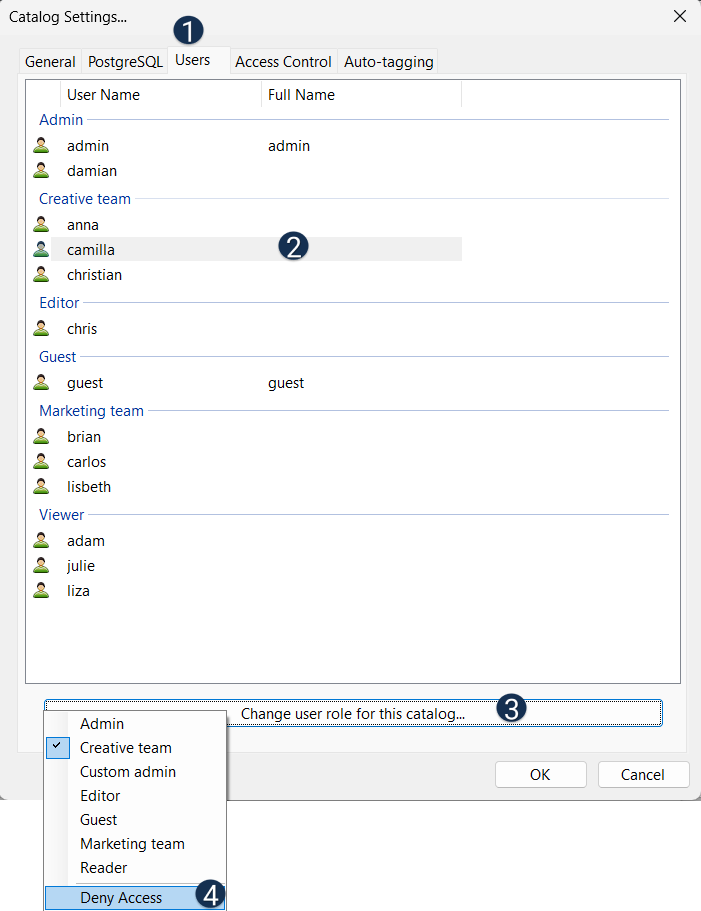 In the Catalog settings window, navigate to the Users tab. Select the user you want to grant or deny access, click ‘Change user role for his catalog‘ and choose ‘Deny Access‘ from the drop-down list