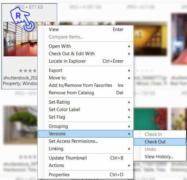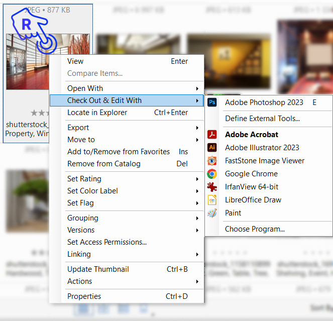Right-click on a thumbnail and choose ‘Check Out & Edit With…’ from the menu. Then, select the appropriate program to edit the file from the submenu. This action checks out the file and immediately opens it in the selected external program for editing.