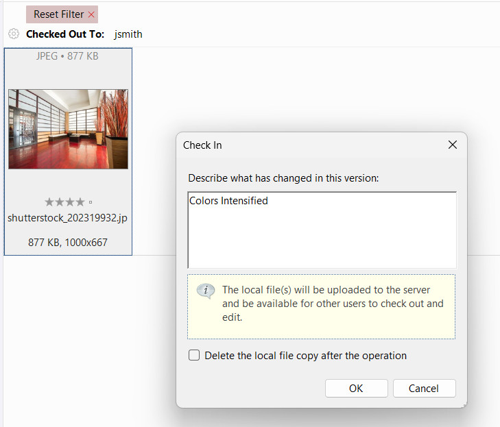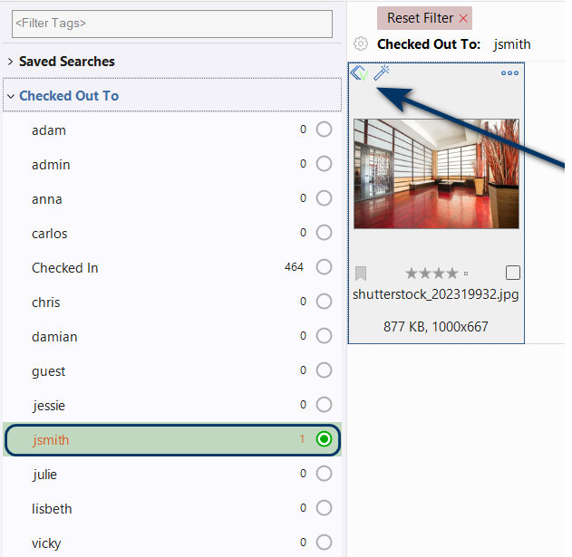 In the Tags panel, under the ‘Checked Out To’ tag, you can now observe that the user jsmith has checked out the file for editing. If you’re the one who checked out the image, you will notice a green “V” on the thumbnail preview. Other users will see a red “V,” indicating that this file is locked.