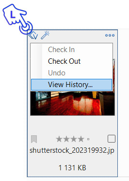 Click on the Versions icon, located above the thumbnail on the left. This action will open a menu where you can select ‘Check Out.’
