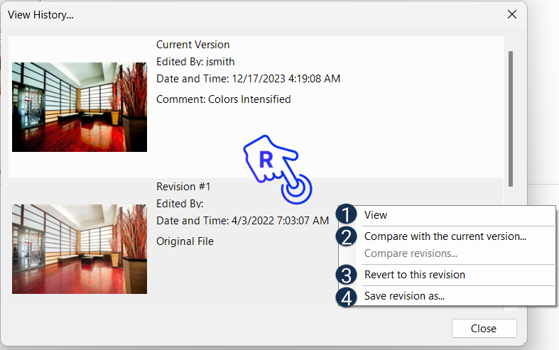 Right-click on any of the previous revisions to be able to:
