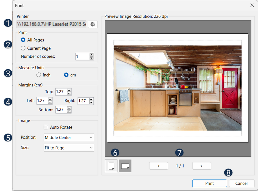 Set the number of copies and choose whether to print all pages (if multiple images were selected) or just the current page.