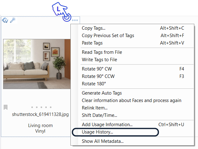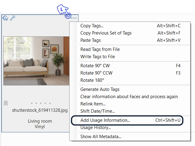 To add usage information to an asset, right-click the three dots icon in the top right corner of the thumbnail and click Add Usage Information. Alternatively, use the shortcut using the shortcut Ctrl+Shift+U.