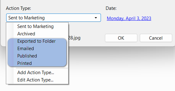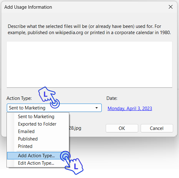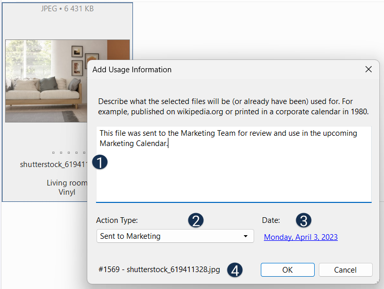 Daminion automatically generates usage information for certain actions and saves it along with the respective assets. For example, you can see when an asset was printed or sent via email and by whom. In addition to the usage actions stored by default, you can create custom actions and add comments to them. The Comment function is useful for conveying important information about certain items to other users.