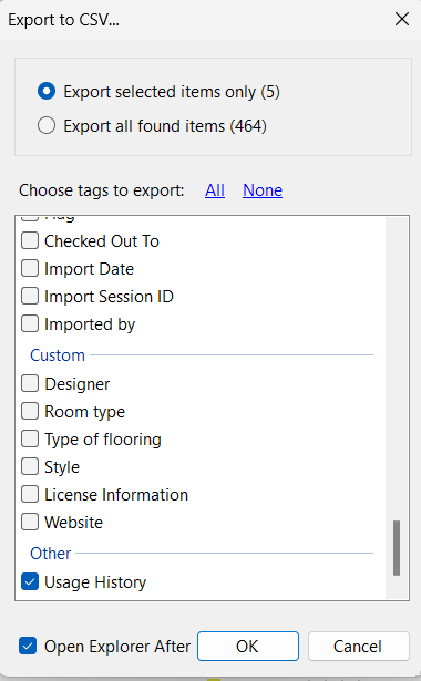 You can choose to export only the Usage History or include additional metadata fields. Once the CSV file is created, you can open it in Notepad or Excel.
