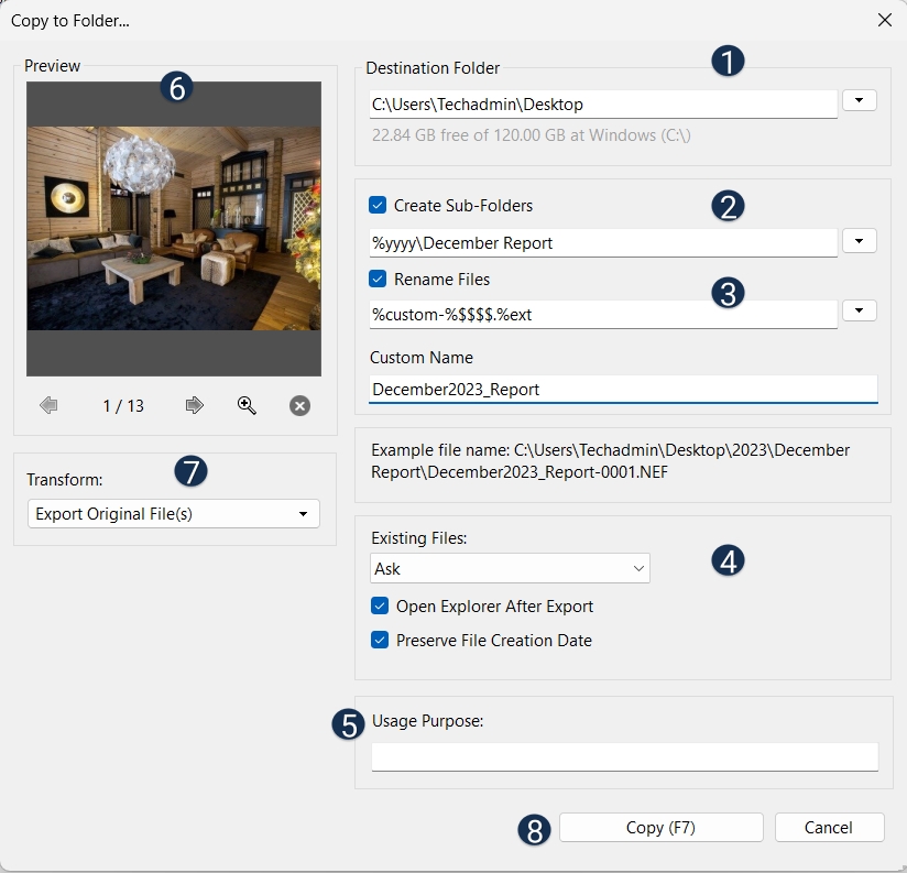 In the ‘Copy to Folder’ dialog box that opens, Daminion provides you with the following options: