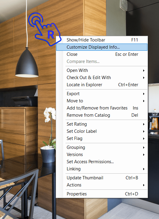 To customize the metadata caption, right-click the image and choose “Customize Displayed Info”.