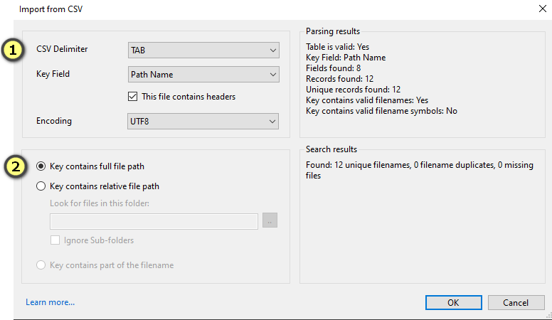 In the window that opens, change the CSV delimiter to “TAB” and select “Key contains full file path”.