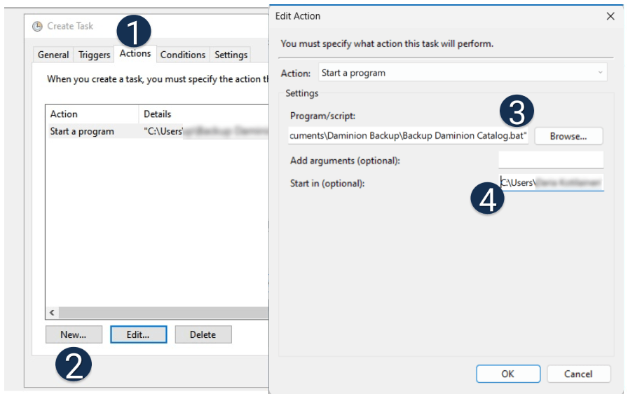 1-4 – Actions > New > Start a program > Browse > Specify a path to the file “Backup Daminion Catalog.bat”.