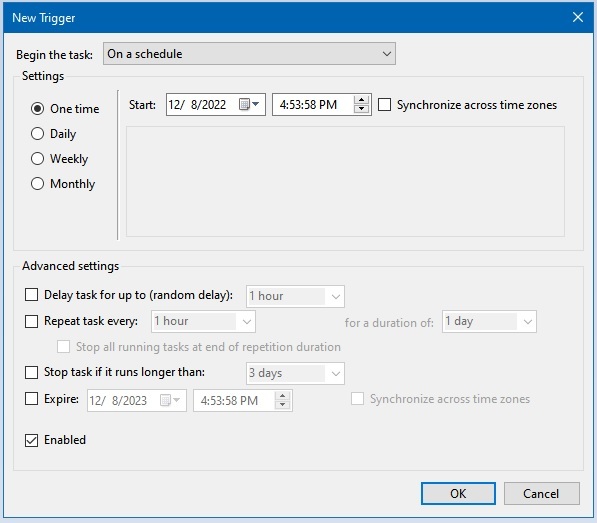 In the Triggers tab, set up a schedule for daily, weekly, or monthly backups and specify the time.