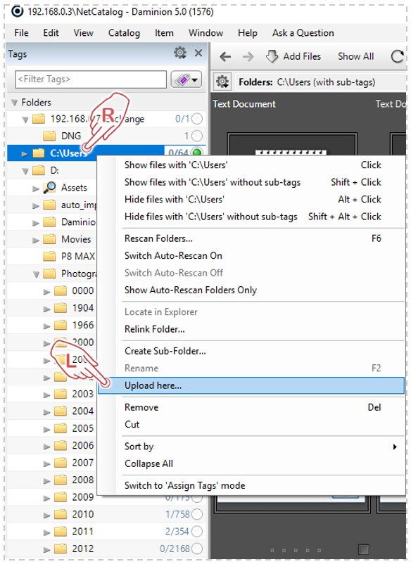 From Daminion version 5.0 onwards you can import files directly to a folder selected on your server. To do this, expand the Folders tab in the Tags panel, right-click the destination folder and select “Upload here”.