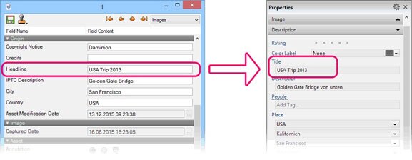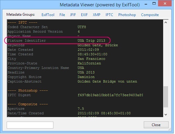 From our example, we can see that the metadata information, “USA Trip 2013”, that was originally entered in the Cumulus “Headline” field, is now located in the file’s IPTC “Fixture Identifier” field. In Daminion this field is linked to the “Event” tag, where it is automatically stored. In the case of our example, the “Title” tag might be a better fit.