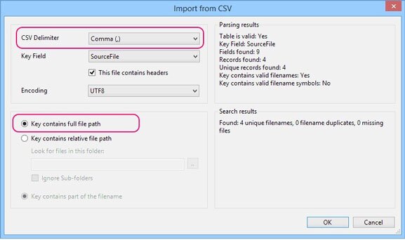 Select “comma” as the “CSV Delimiter” and activate “key contains full file path”.