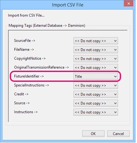 In the “FixtureIdentifier” row, click the “<>” button, select the “title” tag from the drop-down list and click OK.