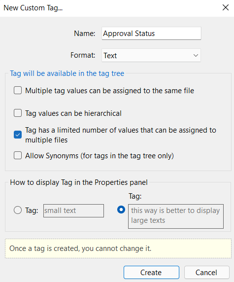 For example, in Canto Cumulus you had a custom tag “Approval Status”. Only one tag value of this tag could be assigned to a file, for example, “Approval Status”:”Approved”, or “Approval Status”:”Waiting for Approval”, or “Approval Status”:”Rejected”