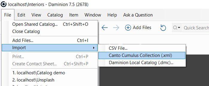 3 – Once connected, click on File > Import > Canto Cumulus Collection (.xml)