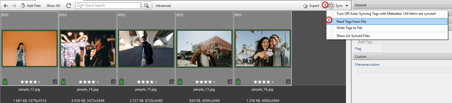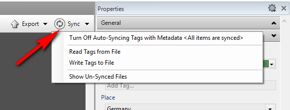 5 – Now in Daminion select the files you edited in Lightroom, click the Sync button and select “Read tags from files”.