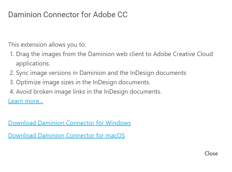 In the window that opens you can read the description of Daminion Connector’s core functionalities and download the Daminion Connector installer for your OS.