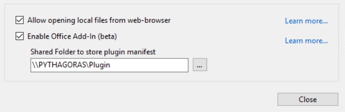 In the window that opens, check a checkbox “Enable Office Add-in” and point it to a shared folder to store a plugin manifest file. It can be a shared folder on Daminion Server PC or on any other machine in the network. The main condition is that anyone who will be using Daminion Connector should have access to this folder.