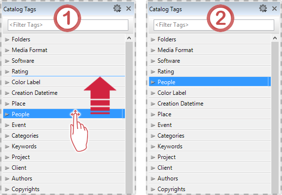 Use the up and down buttons to change the sorting order of the tags. You can also perform a custom sort by drag&drop the tags directly within the Catalog Tags Panel.