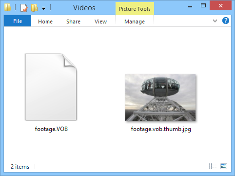 Replace the first part, filename.ext, with the name of the video file. In our case, this gives us footage.vob.thumb.jpg
