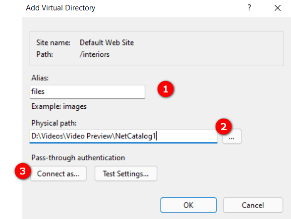 - Set alias as “files” and Physical path exactly the same as for the Virtual Directory “fileserver”. After that, set up the user (Connect as > Specific user > Daminion Server Service logon user) and and click on “Test Settings”.