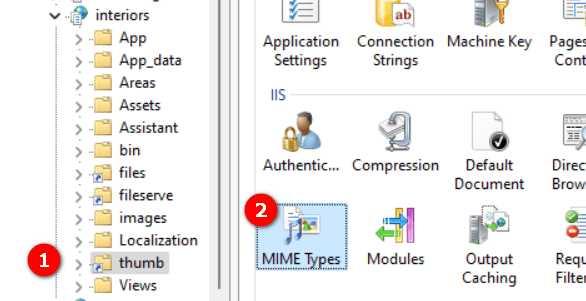 If this file is missing, open IIS, navigate to the application, select “thumb” and click on MIME Types.