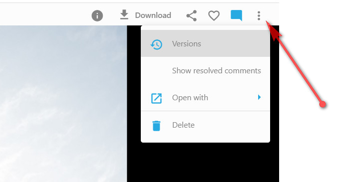 Click on the three dots icon in the upper right corner to display the Versions of the image (if any) or show the resolved comments.