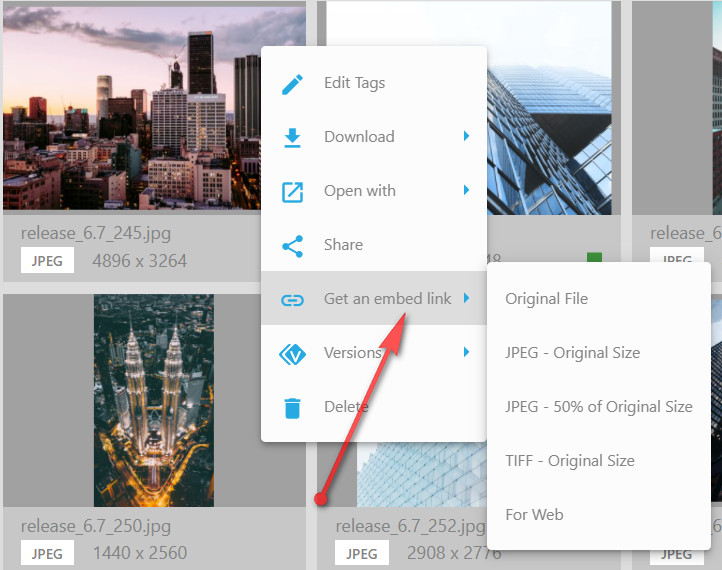 To generate a static link for a file, click on the three dots icon on the thumbnail and select “Get an embed link”. You can select a transformation preset or an original file.