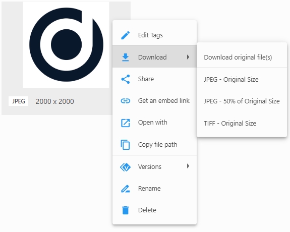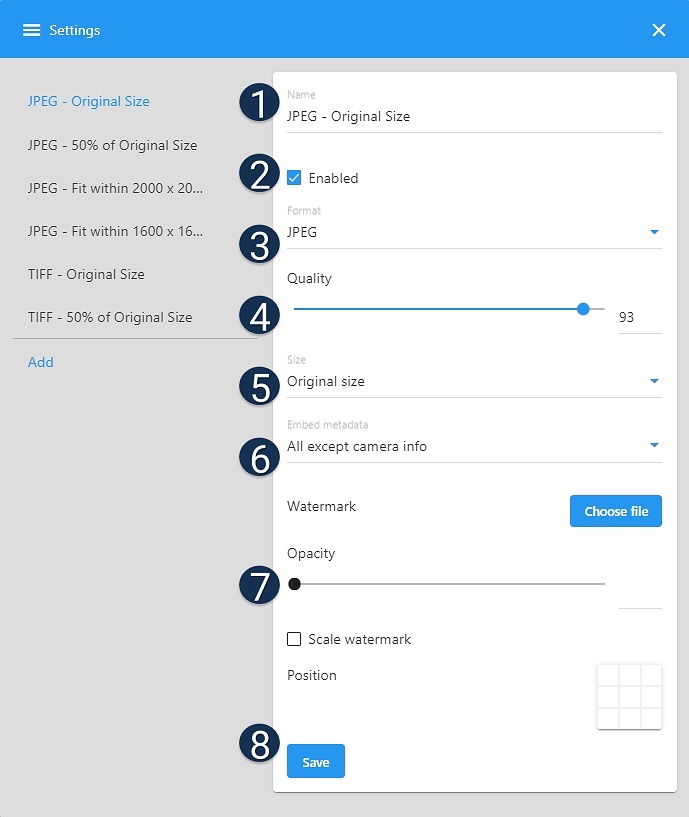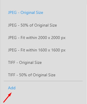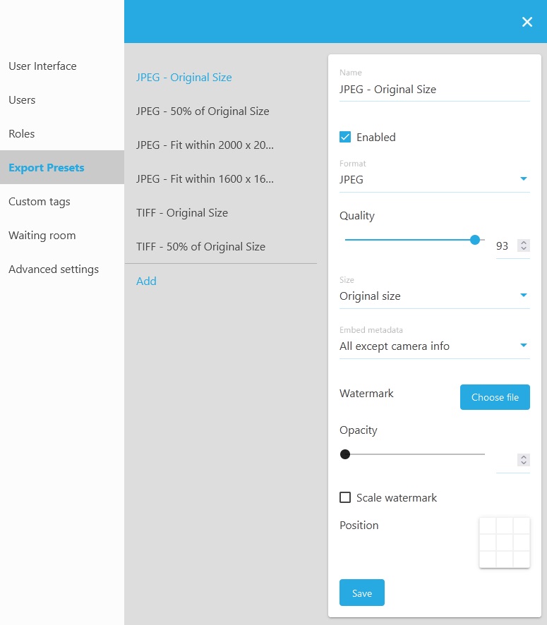 The Export Settings menu in the web client allows you to create export presets to be applied to files when you download them. You can select a file and by applying the export preset, resize it, apply a watermark, change the format, and embed or exclude metadata.