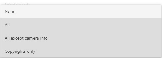6 – Choose which metadata to embed. You can select not to embed any metadata, embed all metadata, all metadata except camera info,copyrights only.