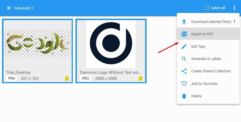 To create a PDF contact sheet in the Daminion web client, select one or more files (you can also use Favorites option), click the three dots button in the upper right corner of the thumbnail area, and select Export to PDF.