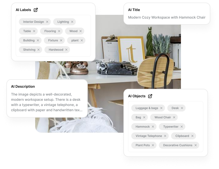 Save time with AI-based image tagging (keywords aligned to your taxonomy), audio & video transcription with searchable text, facial recognition, and duplicate/similar image detection.