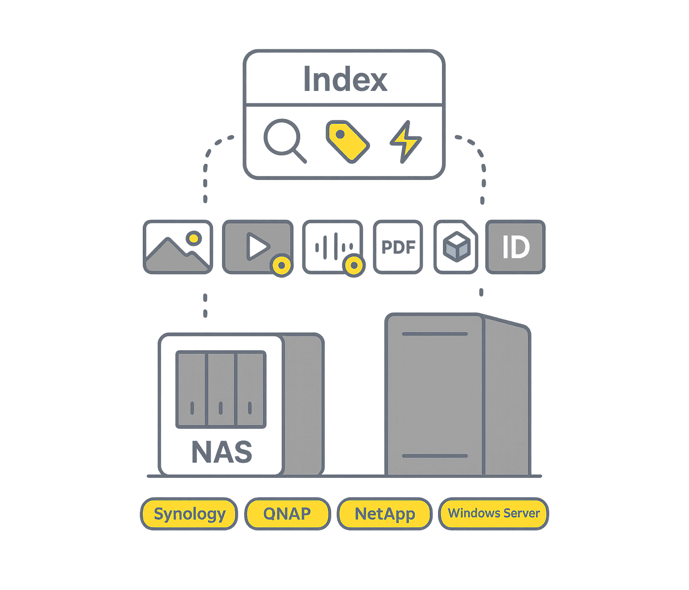 Compatible with all major NAS and file server setups — including Synology, QNAP, NetApp, and Windows Server. Daminion works as a lightweight overlay: your files stay on NAS while the system adds indexing, tagging, and fast search.