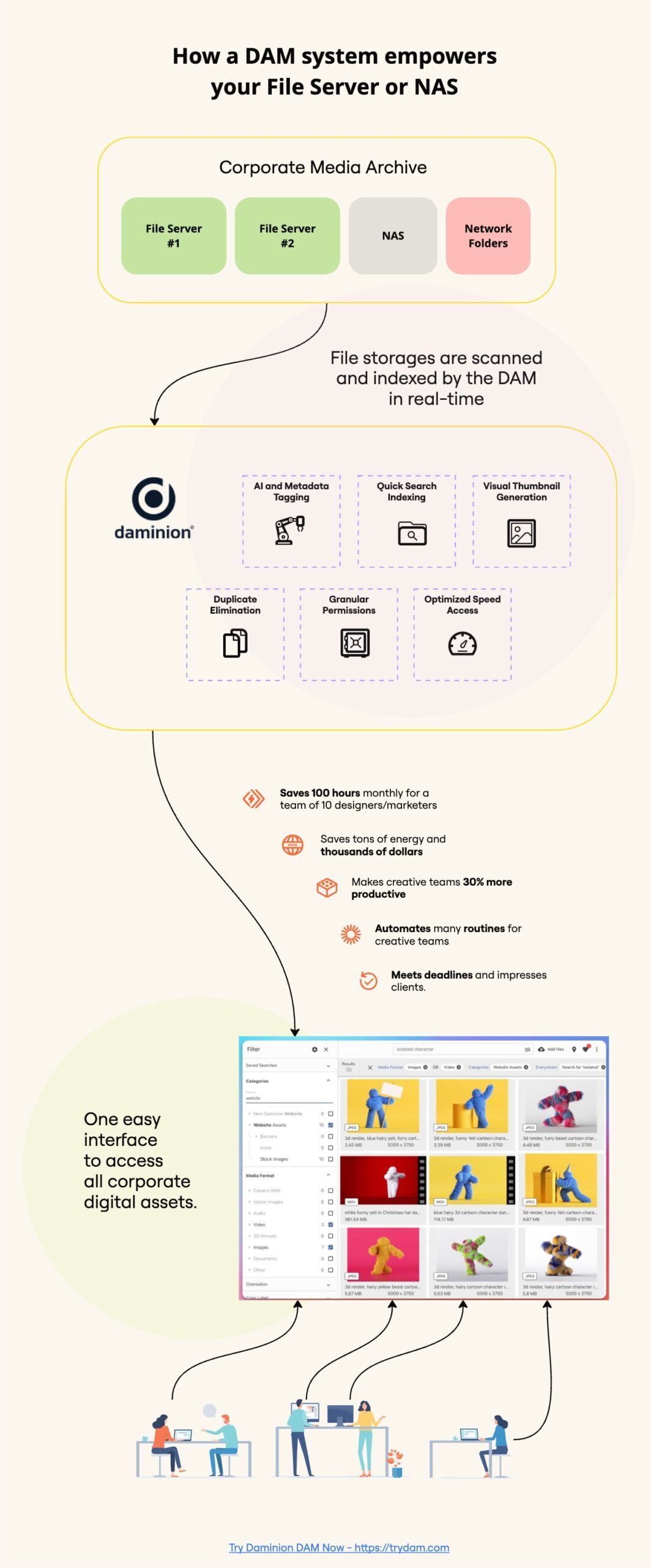 All company employees gain instant access to any files and documents using a web browser. After the DAM system is installed, any subsequent file changes will be automatically reflected in Daminion.