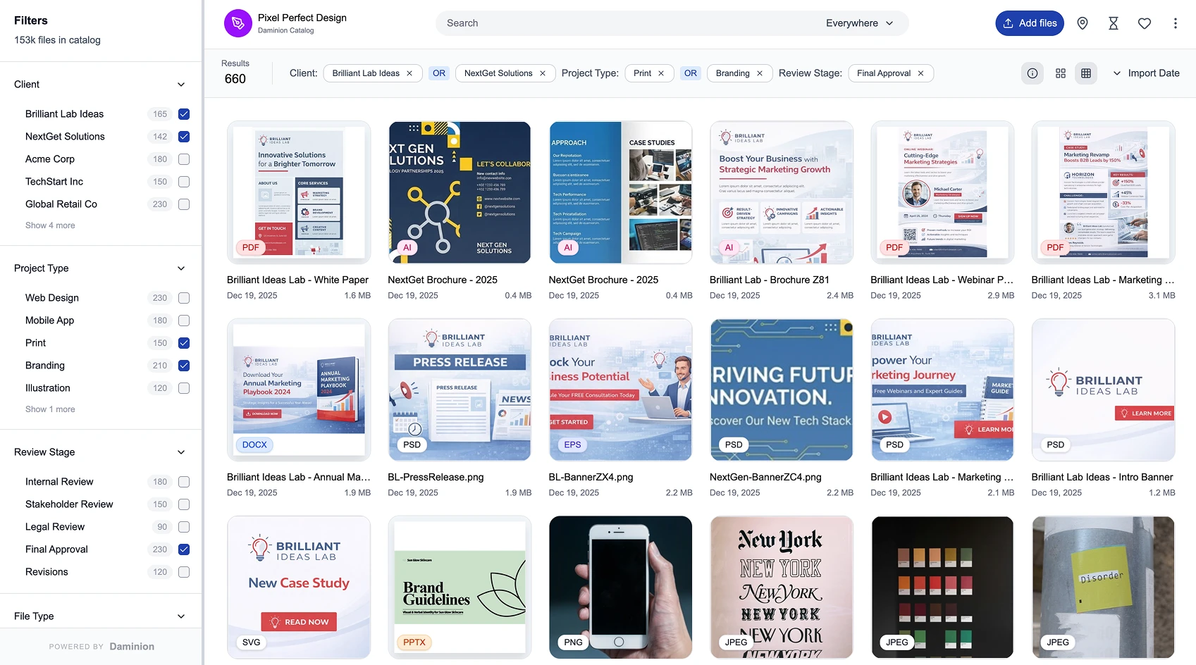 Daminion brings active files, approved outputs, and past project materials into one structured library. Designers and production teams stop juggling local folders and shared drives and know exactly where to go for the right assets.